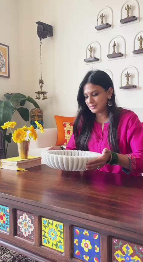 Elevate your home decor and special occasions with the stunning Marble Urli in a scalloped shape! Perfect for decorating with flowers or candles, it adds a touch of elegance to any entrance or function. Bring a touch of luxury and versatility to your space with this unique piece.