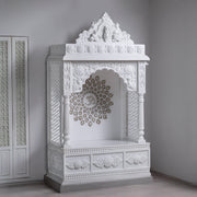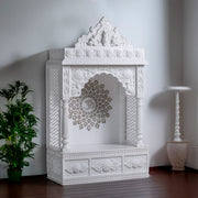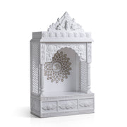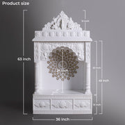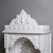Marble Temple Golden Chakra: Elegant white marble temple with intricate carvings and a striking golden chakra centerpiece, perfect for serene home worship.