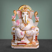 This 15-inch White Marble Statue of Lord Ganesh from Handicraft Bazaar symbolizes wisdom, power, and prosperity. Crafted from premium quality marble, this unique piece features vibrant colour accents and a detailed design of Lord Ganesh sitting on a singhasan and holding a modak in his hand and a mouse by his side. An ideal choice for any home or office.